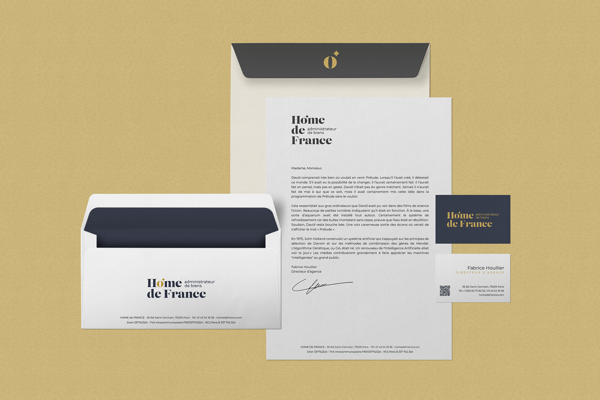 Home de France est une société d'administration de biens située en plein cœur du quartier Latin. Elle a fait appel à mes services pour renforcer son image en me confiant la création de son territoire de communication.