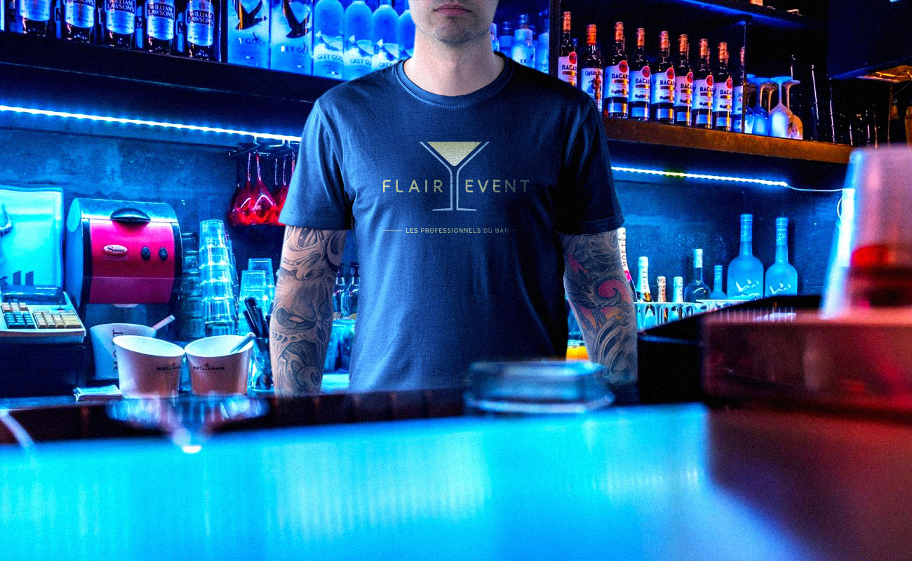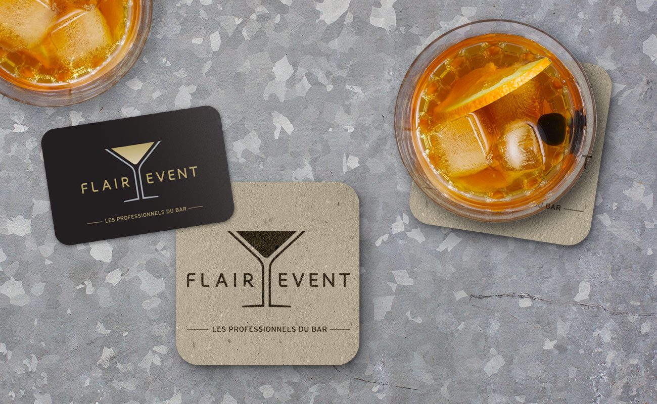 Conception et réalisation du territoire graphique de Flair Event, société spécialisée dans le domaine de l’organisation, du service et de l’animation bar événementiel.